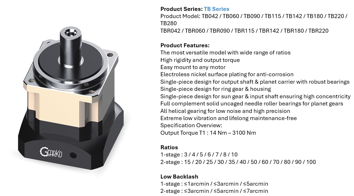 TB series planetary Gearbox,size 115, ratio 15-100:1, standard backlash max 7 arc mins. keyed shaft.